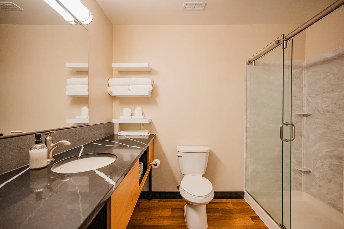 Enjoy the convenience of a mini fridge for your favorite snacks, a contemporary bathroom to refresh and revive, and a dedicated desk to map out your Stillwater adventures. Every moment here invites you to relax, recharge, and feel at home. Thoughtful touches and warm hospitality set the tone for a memorable escape.