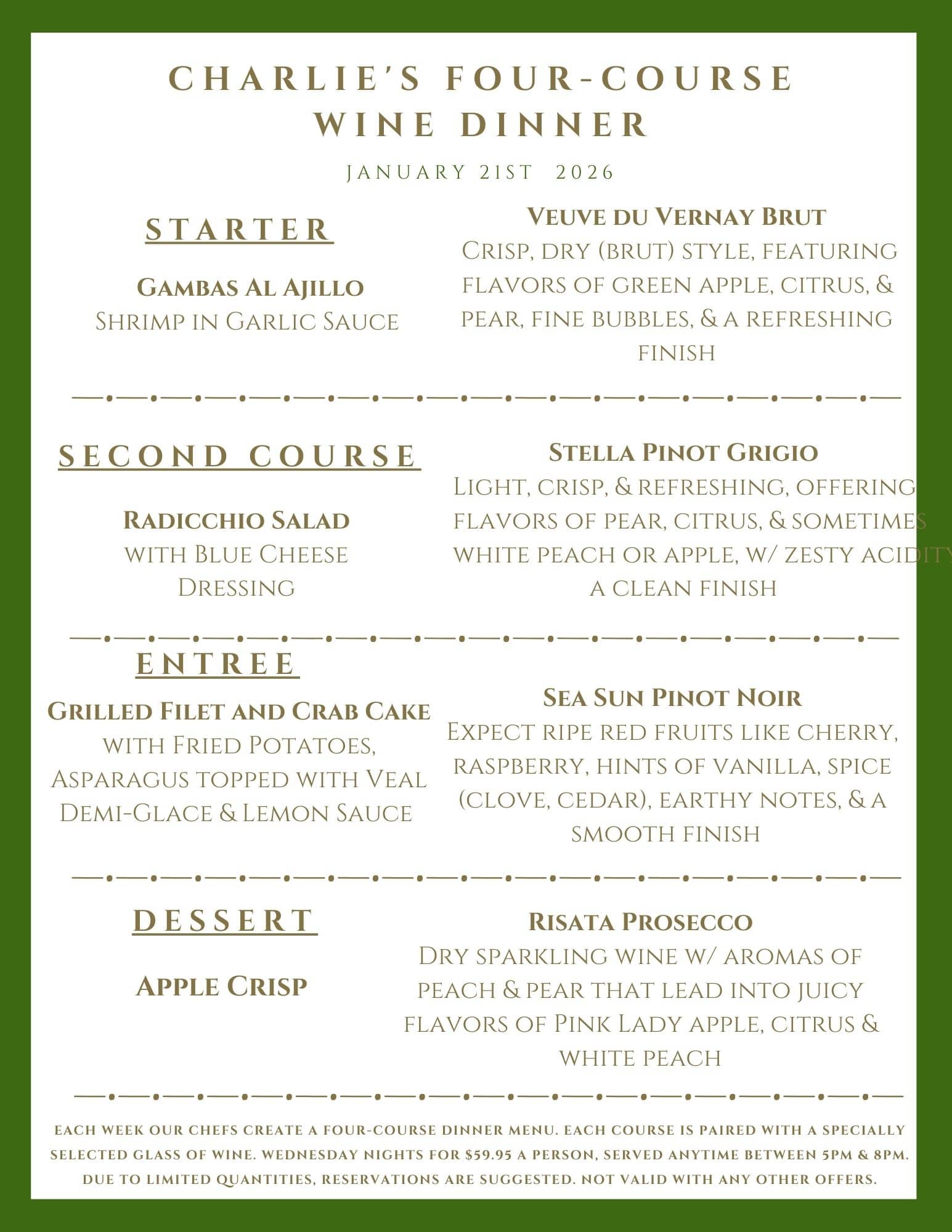 Wednesday Wine Dinner at Charlie’s Restaurant and Irish Pub