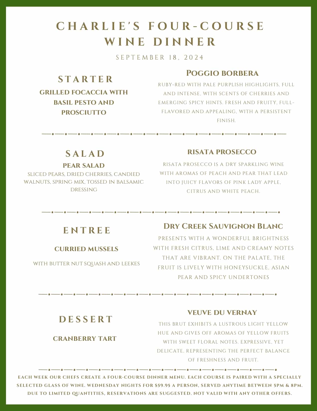 Every Wednesday, the chefs at Charlie’s Restaurant prepare a delicious four-course dinner, accompanied by wine pairings specially selected by our talented bar team, for just $59.95/person. Reservations are required. Reservations: Charlie's Restaurant and Irish Pub - Reservations - Irish, Pubs - Stillwater, MN - Find Open Tables - Yelp