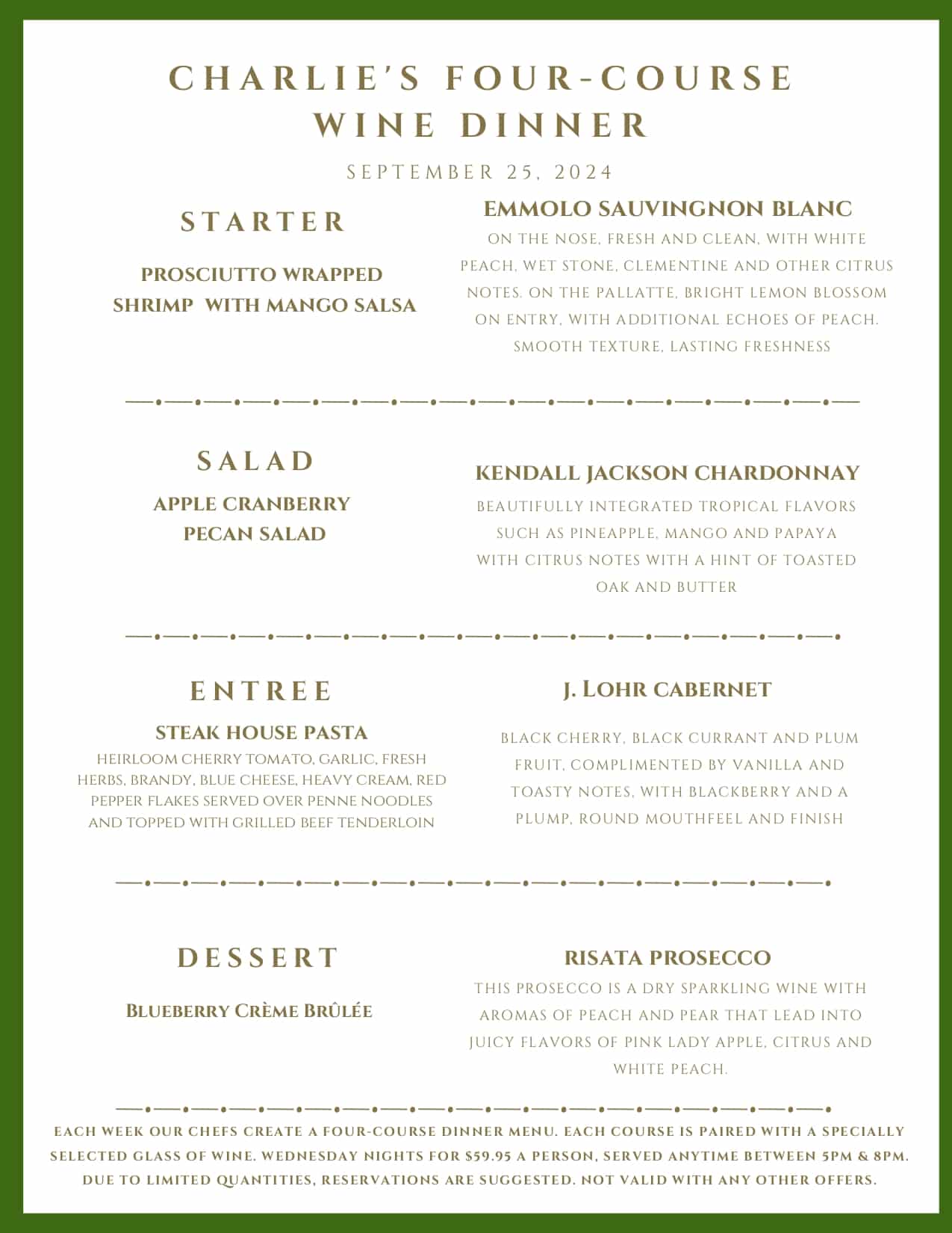Every Wednesday, the chefs at Charlie’s Restaurant prepare a delicious four-course dinner, accompanied by wine pairings specially selected by our talented bar team, for just $59.95/person. Reservations are required. Reservations: Charlie's Restaurant and Irish Pub - Reservations - Irish, Pubs - Stillwater, MN - Find Open Tables - Yelp