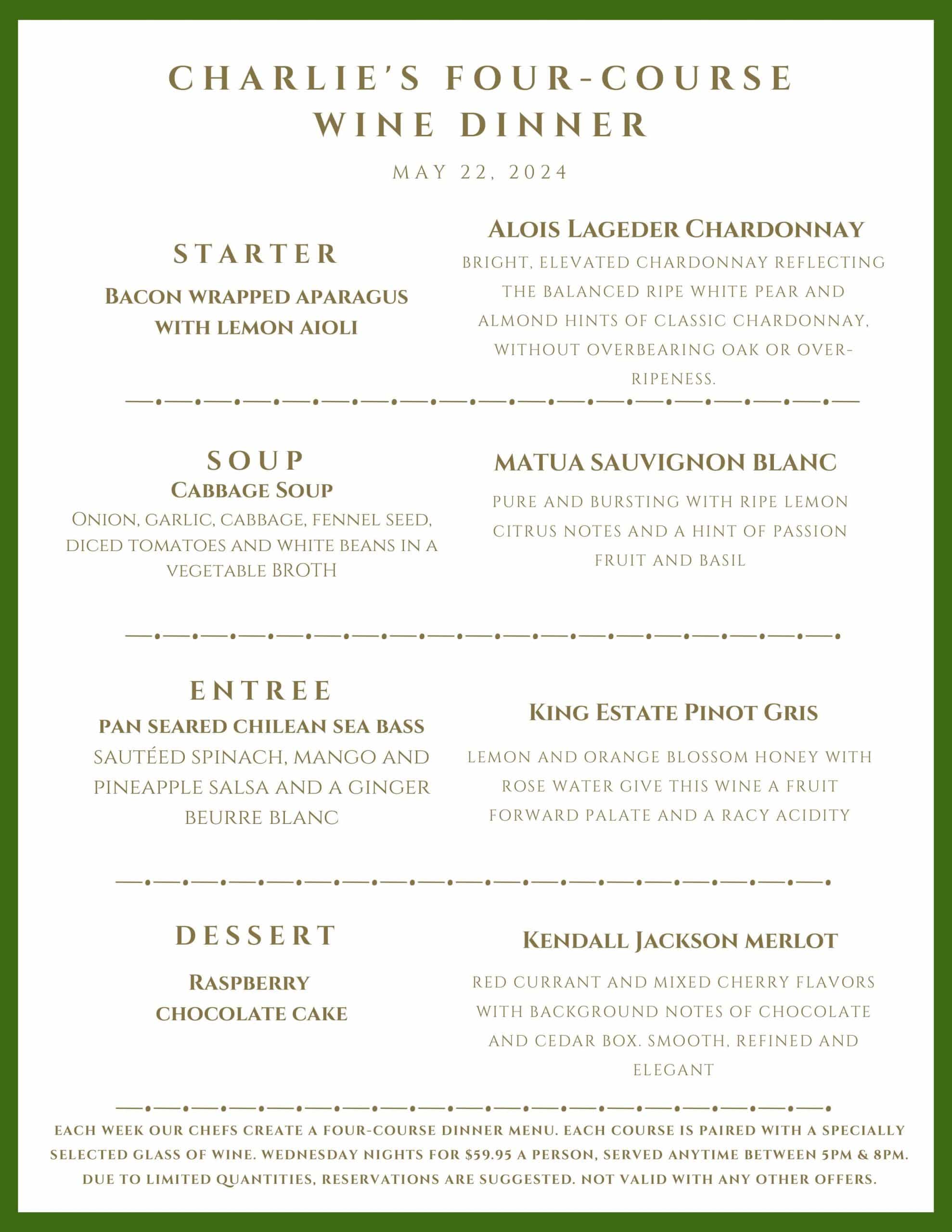 Every Wednesday, the chefs at Charlie’s Restaurant prepare a delicious four-course dinner, accompanied by wine pairings specially selected by our talented bar team, for just $59.95/person. Reservations are required. Reservations: Charlie's Restaurant and Irish Pub - Reservations - Irish, Pubs - Stillwater, MN - Find Open Tables - Yelp