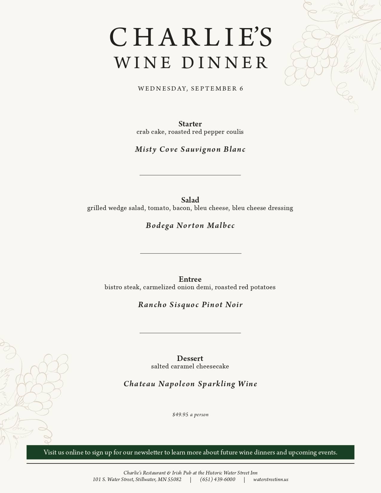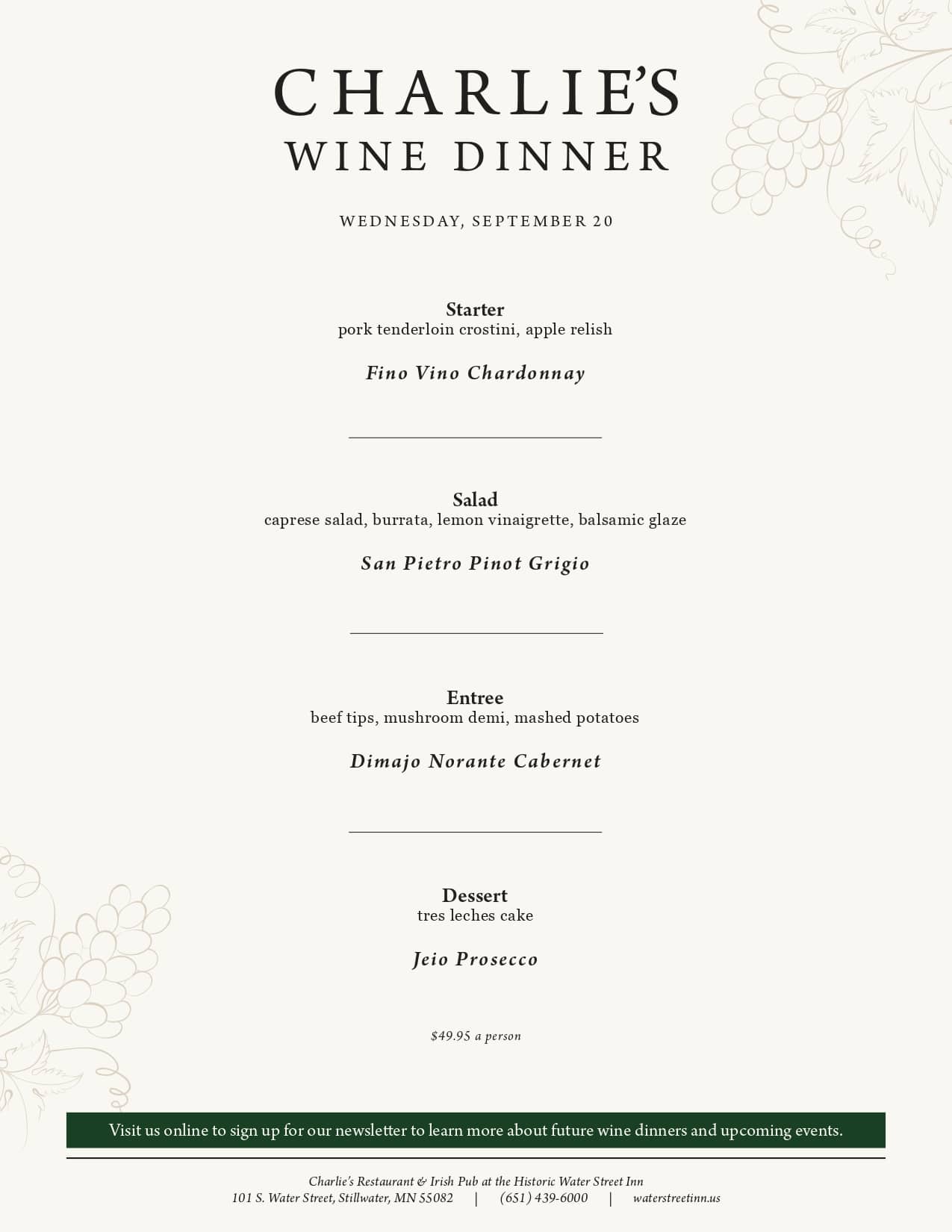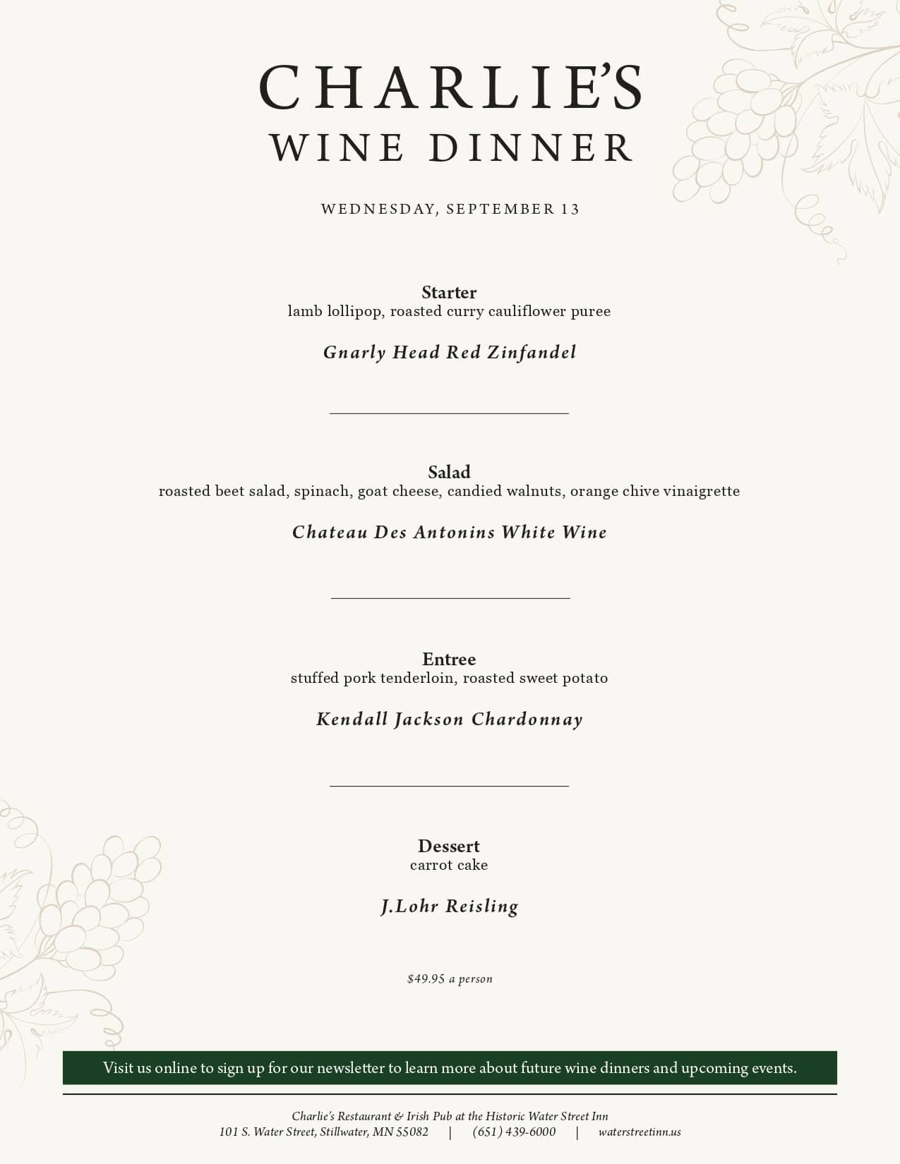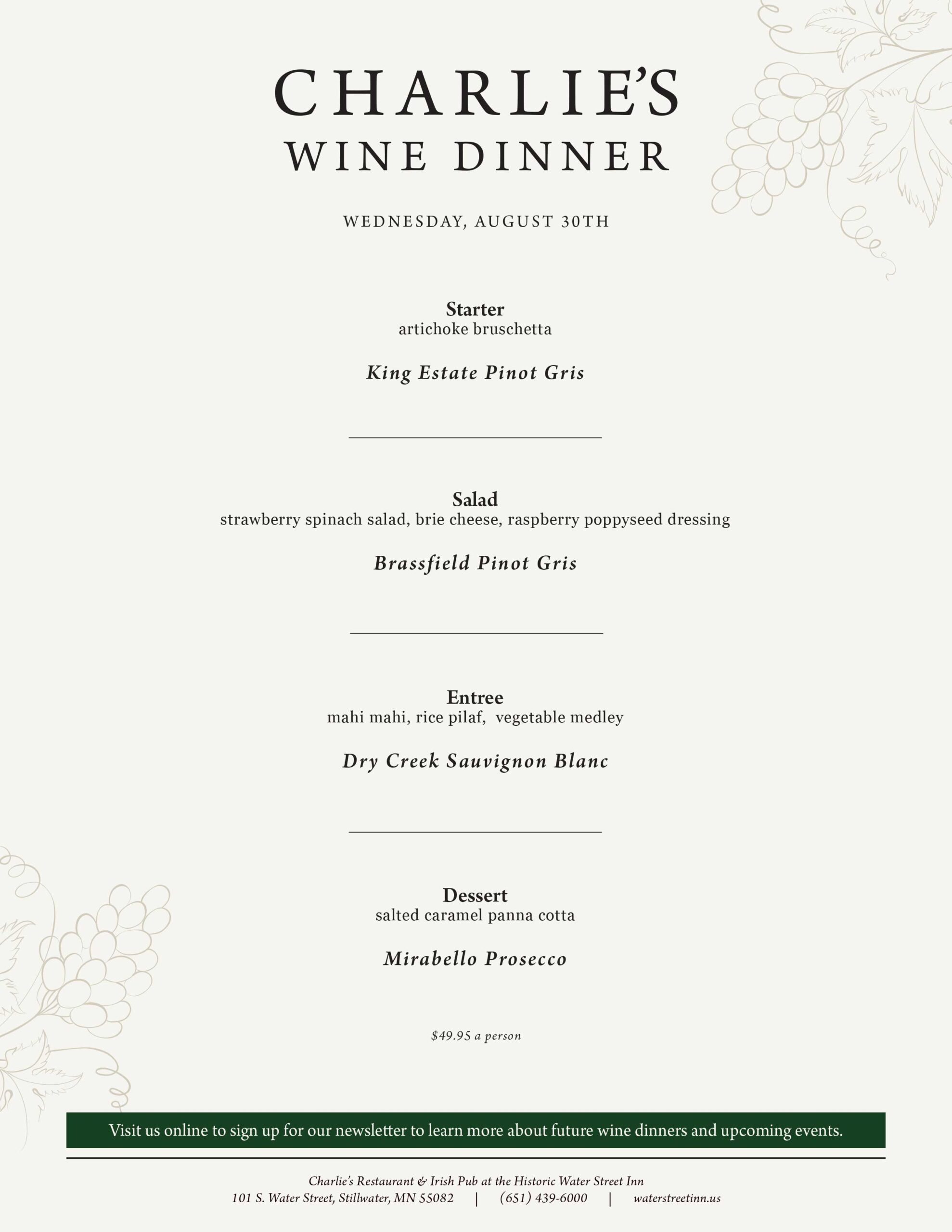 Every Wednesday, the chefs at Charlie’s Restaurant prepare a delicious four-course dinner, accompanied by wine pairings specially selected by our talented bar team, for just $49.95/person. Reservations are required. Reservations: Charlie's Restaurant and Irish Pub - Reservations - Irish, Pubs - Stillwater, MN - Find Open Tables - Yelp Event Menu